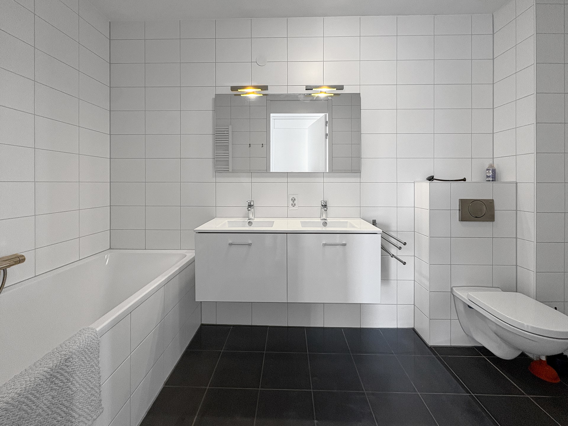 De nette badkamer beschikt over een ligbad, douche en wastafel. Daarnaast is er een aparte wasruimte met wasmachine, droger en extra vriezer.